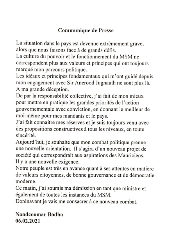 « Ce matin, j’ai soumis ma démission en tant que ministre et également de toutes les instances du MSM », a indiqué Nando Bodha dans un communiqué adressé à la presse.